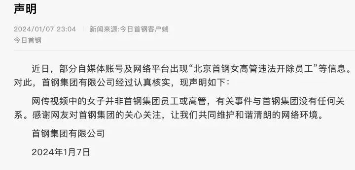 首钢集团有限公司经过认真核实,现声明如下:网传视频中的女子并非首钢集团员工或高管,有关事件与首钢集团没有任何关系。感谢网友对首钢集团的关心关注,让我们共同维护和谐清朗的网络环境。