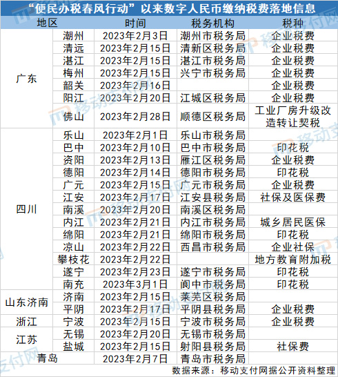 据移动支付网不完全统计,近日以来包括广东省、四川省、江苏省、济南、宁波、青岛等在内的各个试点地区纷纷加速落地数字人民币缴纳税费,其中当数广东、四川各地落地案例较多。