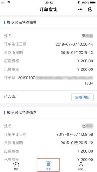 点击小程序页面下方的“订单”按钮,查询缴费记录和缴费状态: