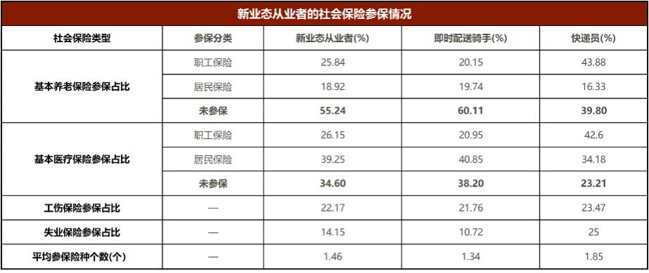 而根据“我国新业态从业人员就业与社会保障(2022)”课题组调查,新业态从业人员整体社会保险的参保率较低,每人平均参保的社会保险险种只有1.46个。其中,超过60%的即时配送骑手未参保基本养老保险,38%以上未参保基本医疗保险。工伤保险的整体参保占比甚至低至22%,而这一险种对骑手和快递小哥们的重要性早已无需多言。
