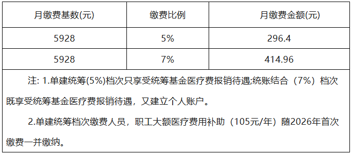2.单建统筹档次缴费人员,职工大额医疗费用补助(105元/年)随2026年首次缴费一并缴纳。