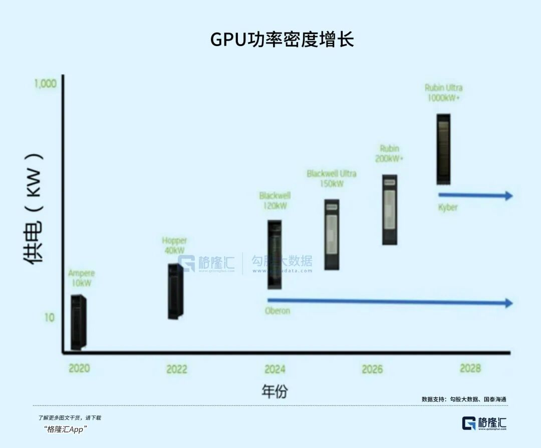 传统IDC单机柜功率仅5-8kW,AI数据中心机柜功率密度可达30-150kW,差距极其巨大。
