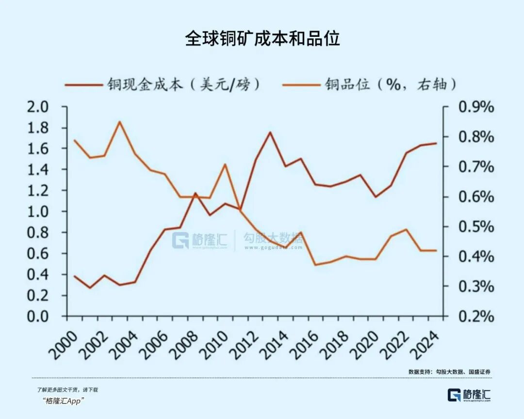 也就是说,为了得到同样的一吨铜,需要挖掘、破碎、浮选几倍的矿石,开采成本飙升。