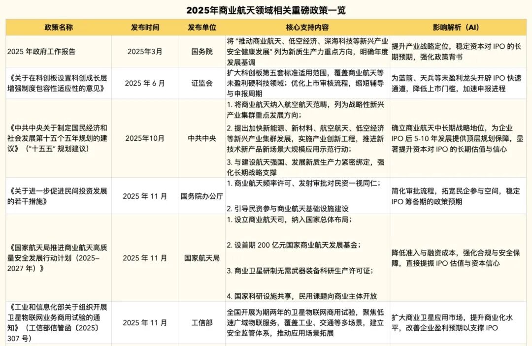 中央层面,“十五五”规划将商业航天列为“战略性新兴产业集群重点发展方向”;国家航天局设立商业航天司,同步设首期200亿国家商业航天发展基金;证监会扩大科创板第五套标准适用范围,明确覆盖商业航天领域,为行业巨头开辟IPO通道。