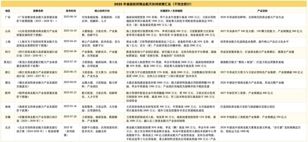 地方层面,北京、广东、山东、四川等多地地方政府为推动商业航天发展精准落地扶持措施。