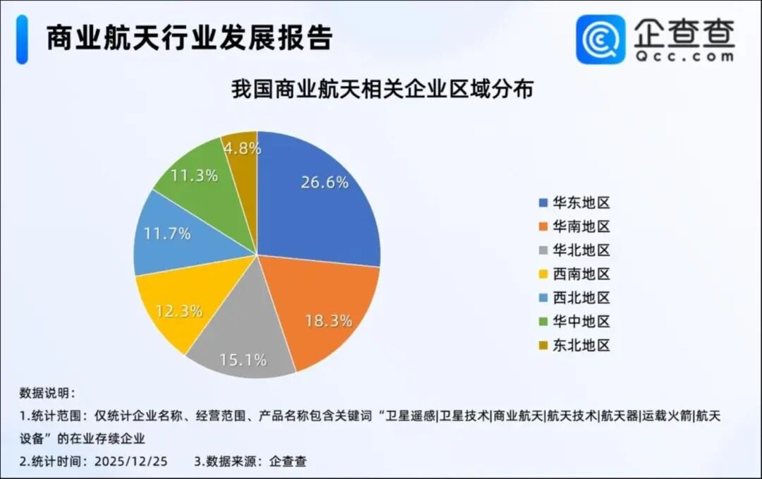 行情狂飙之下,2025年,商业航天赛道正吸引更多玩家涌入。企查查数据显示,截至12月25日,我国现存超9.3万家商业航天相关企业,2025年以来,我国已注册2.48万家商业航天相关企业,其中前11个月注册2.28万家,比2024年同期增加57.5%。区域分布上,华东地区的相关企业最多,占比26.6%,其次是华南地区。此外,2025年新注册企业的一大特点是,华北地区占比反超华南地区,成为今年新注册企业数量第二多的区域。