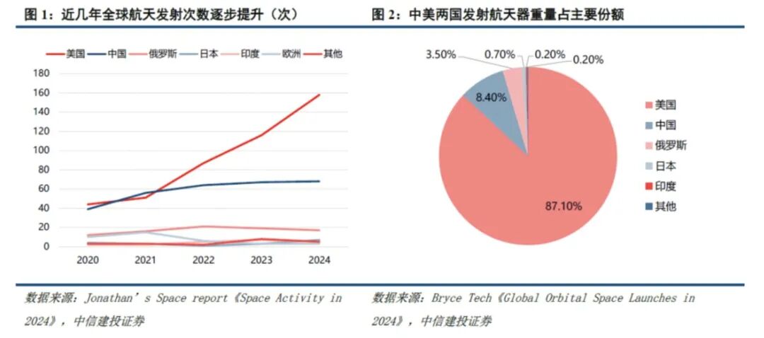东吴证券研究所数据显示,2024年,全球轨道级发射总计261发,有效荷载2707个,其中SpaceX共发射2374个,占比87.7%。2025年,SpaceX发射提速,截至11月23日,已完成151次任务,计划全年发射170次,去年全年SpaceX共执行134次轨道发射任务。