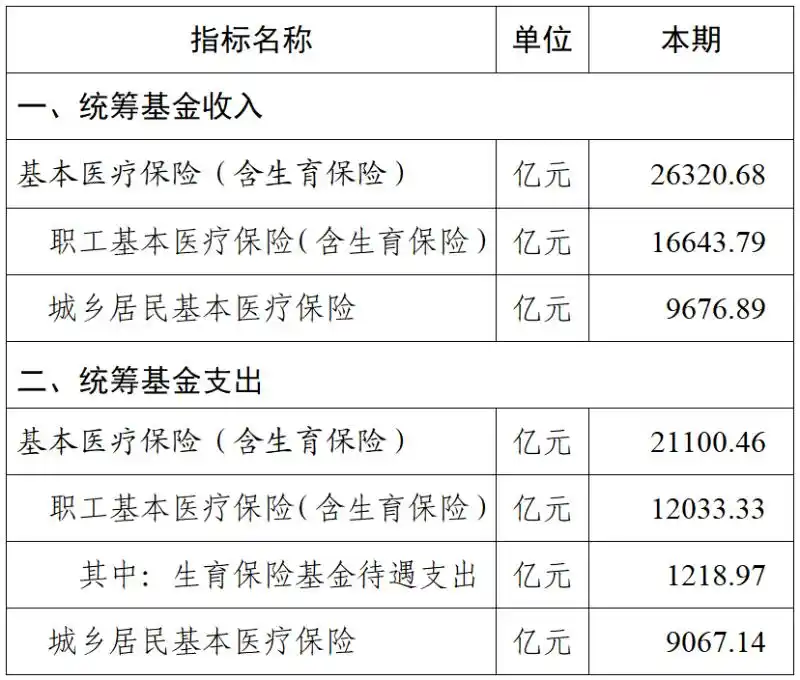 2025年前11个月,职工基本医疗保险(含生育保险)统筹基金支出12033.33亿元,其中生育保险基金待遇支出1218.97亿元;城乡居民基本医疗保险统筹基金支出9067.14亿元。