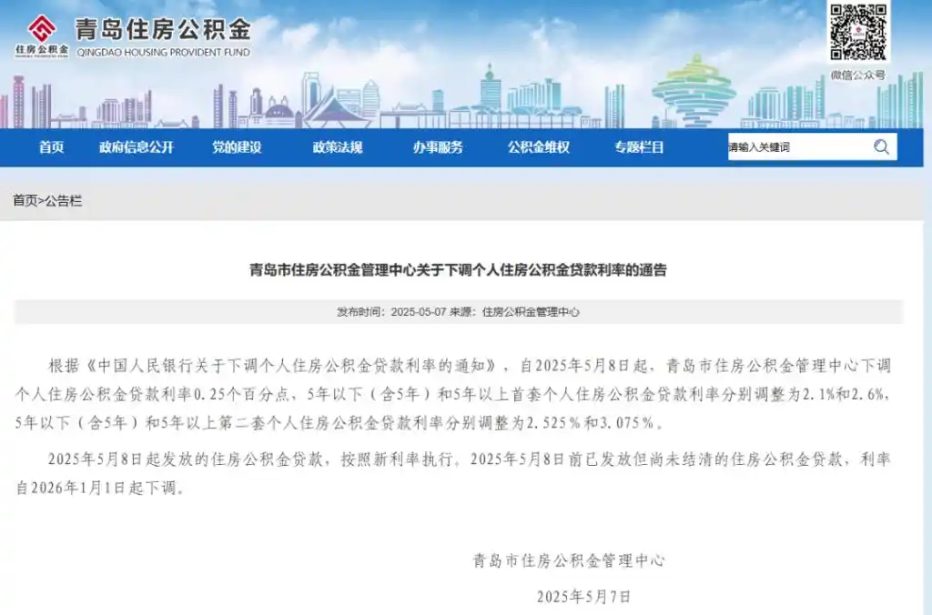 自2025年5月8日起,青岛市下调个人住房公积金贷款利率0.25个百分点,5年以下(含5年)和5年以上首套个人住房公积金贷款利率分别调整为2.1%和2.6%,5年以下(含5年)和5年以上第二套个人住房公积金贷款利率分别调整为2.525%和3.075%。