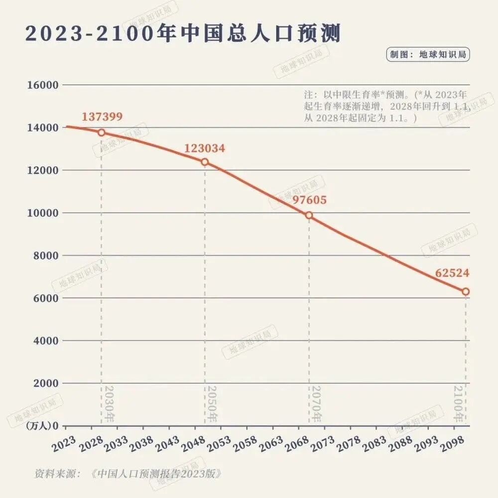 《中国人口预测报告2023版》的人口预测值得参考,根据这份报告的预测,若保持现在的生育率不变,到2030年中国人口将降为13.74亿,到2050年中国人口将降为12.30亿。