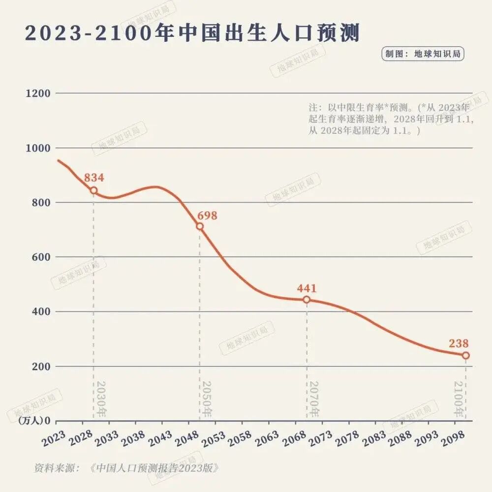 而中国的出生人口数量,在2030年将为834万,和现在的数字差不太多,但随着出生率的持续低迷以及育龄妇女数量的减少,这个数字将会进一步降低,到2050年中国的出生人口估计将跌到698万。