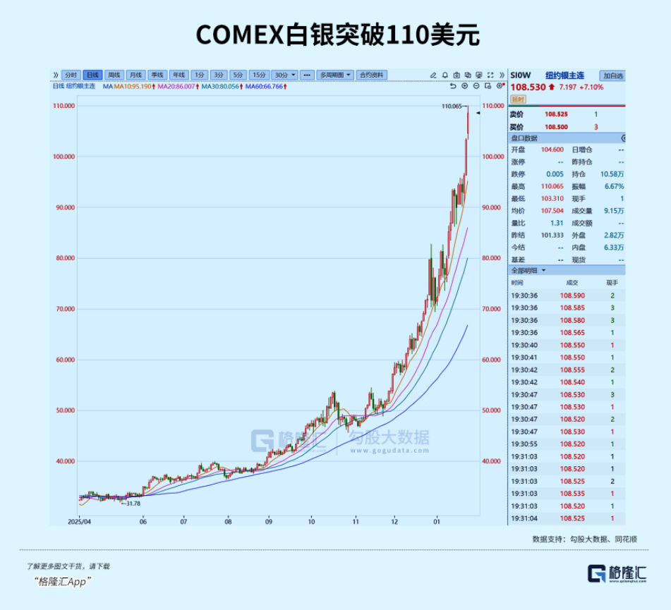 继周末破百后,1月26日白银价格继续疯涨,一度突破110美元/盎司。