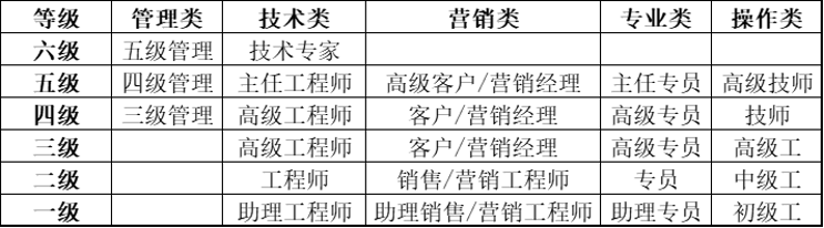 第一,划分岗位序列、确定职位。华为职位分为五类、六级:
