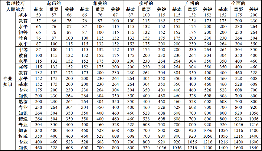 2、核心标准,是用于衡量能否获得资格的主要标尺,包括必备知识、技能、行为和素质,其中知识是各类任职资格标准必须具备的,而技能、行为和素质则可以根据职位特点进行选择组合,但至少包含其中一种: