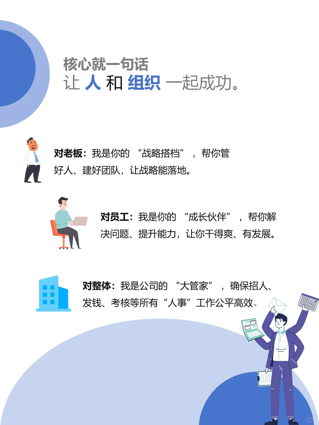 对人事:是大管家,招人、发钱、考核全 hold 住!