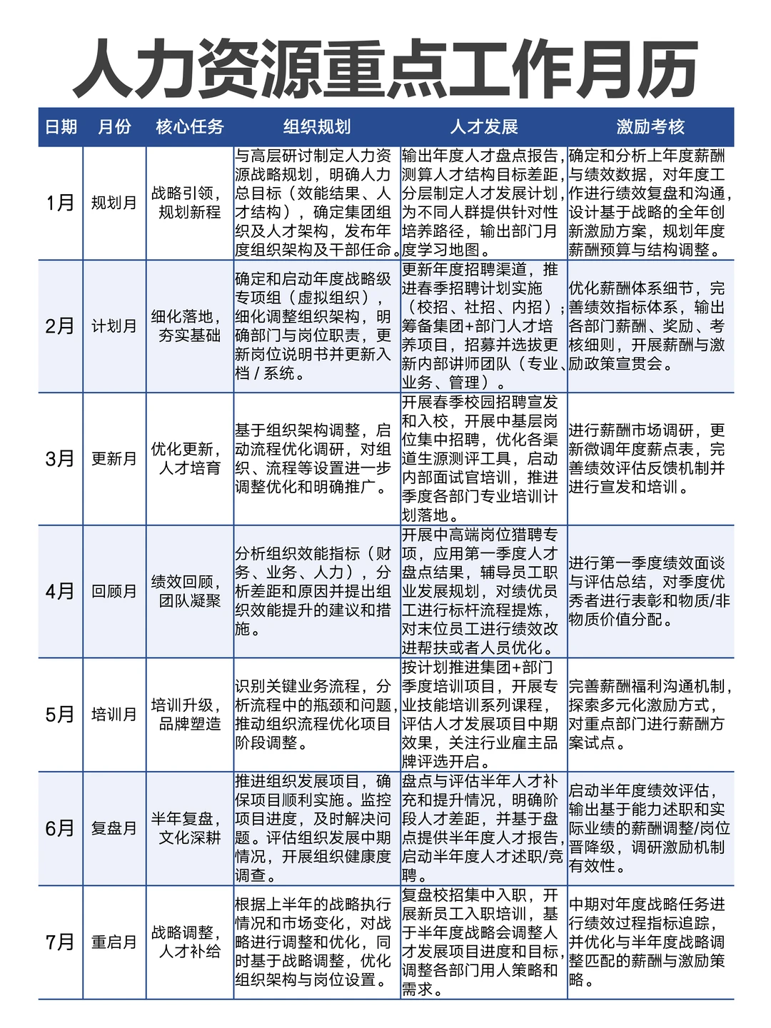 作为HR,每个月都有不同的工作重点,提前规划才能高效不踩坑!今天分享一份「人力资源重点工作月历」,HR们可以收藏一下,帮你搞定人力资源流程🌟