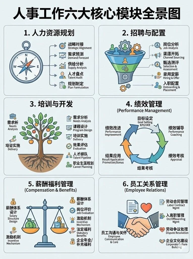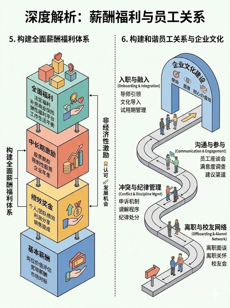 员工关系:入职融入(导师引领+文化导入)→ 沟通参与(员工座谈会+满意度调查)→ 冲突管理(申诉机制+纪律处分)→ 离职网络(校友会+关怀) *小贴士:薪酬体系要“全面+公平”,员工关系要“全周期关怀”,才能留人又提效——*