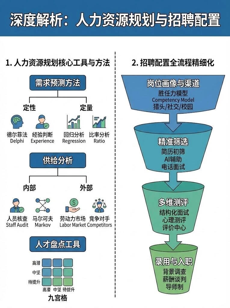 规划工具:需求预测(德尔菲/回归分析)+ 供给分析(内部/外部)+ 人才盘点(九宫格)