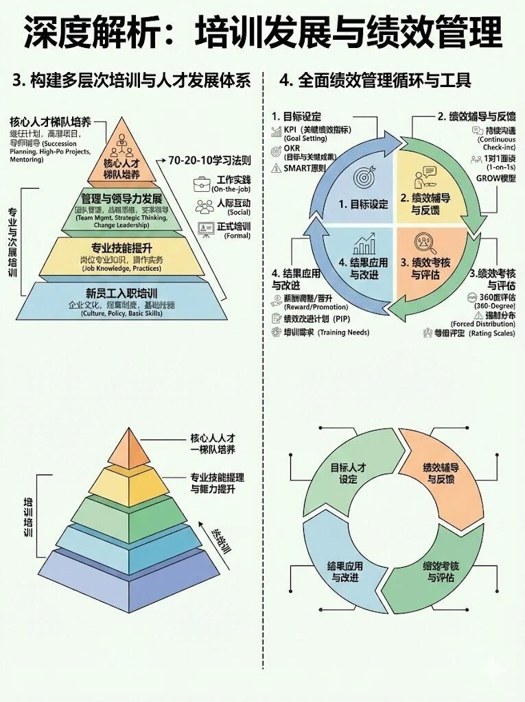 多层次培训:新员工入职(文化/政策)→ 专业技能(岗位知识)→ 管理领导力(战略思维)→ 核心人才(继任计划)
