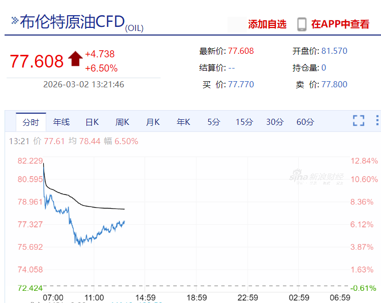 今天布伦特原油期货一度暴涨13%,冲高至82.37美元/桶,但很快回落,说明市场也在押注封锁霍尔木兹海峡是短期事件。