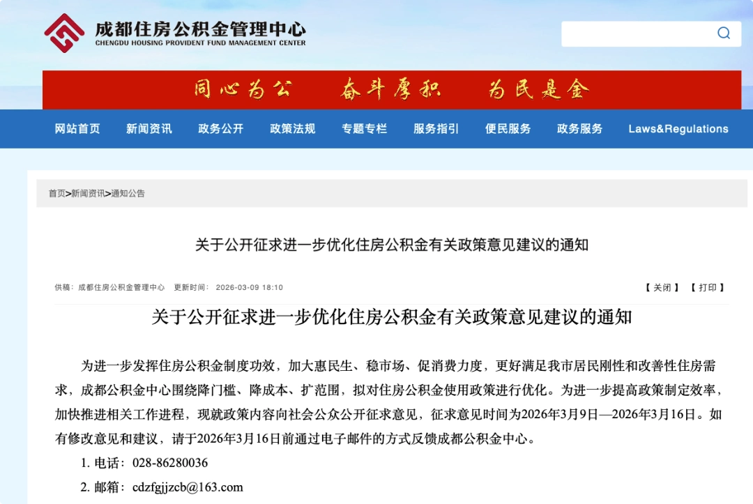 目前,政策内容正向社会公众公开征求意见,征求意见时间截至2026年3月16日。如有修改意见和建议,请于2026年3月16日前通过电子邮件的方式反馈成都公积金中心(邮箱:cdzfgjjzcb@163.com)。