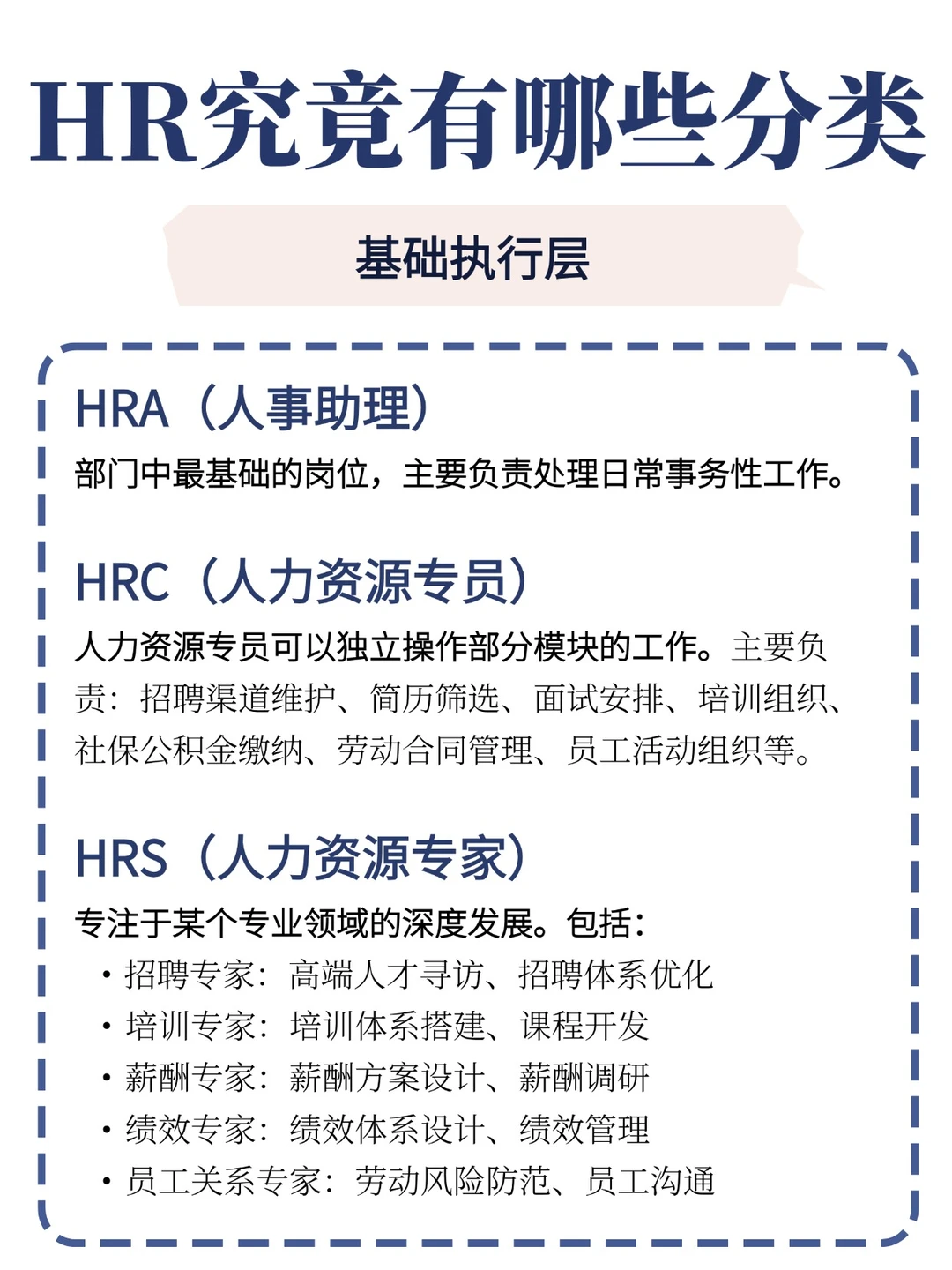 基础/专业执行层职位:HRA(人事助理)、HRC(人力资源专员)、HRS(人力资源专家)。