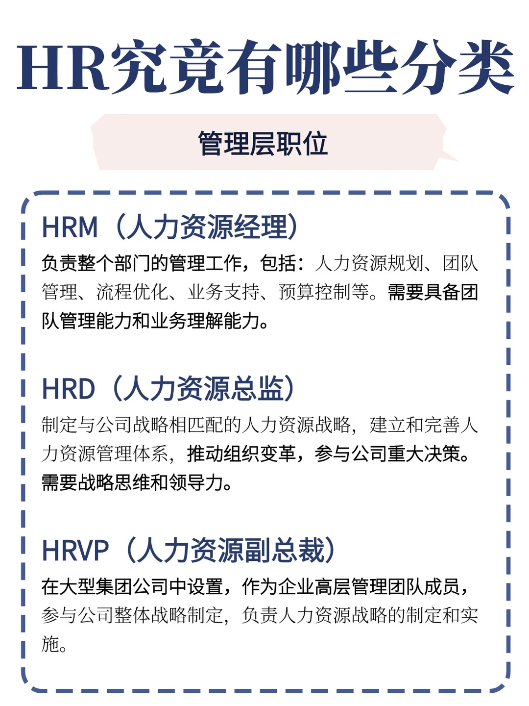 管理层职位:HRM(人力资源经理)、HRD(人力资源总监)、HRVP(人力资源副总裁)。