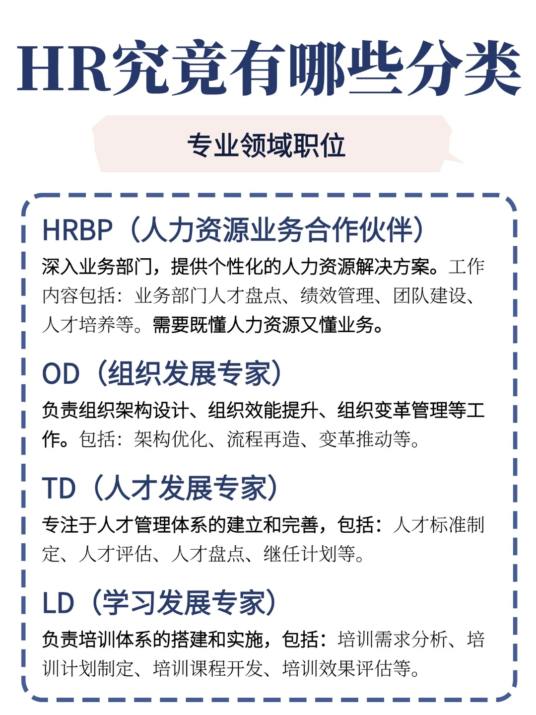 专业领域职位:HRBP(人力资源业务合作伙伴)、OD(组织发展专家)、TD(人才发展专家)、LD(学习发展专家)、OC(组织文化专家)。