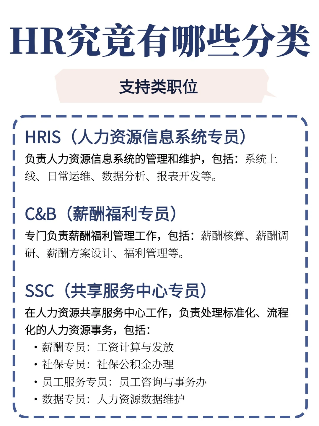 支持类职位:HRIS(人力资源信息系统专员)、C&B(薪酬福利专员)、SSC(共享服务中心专员)。
