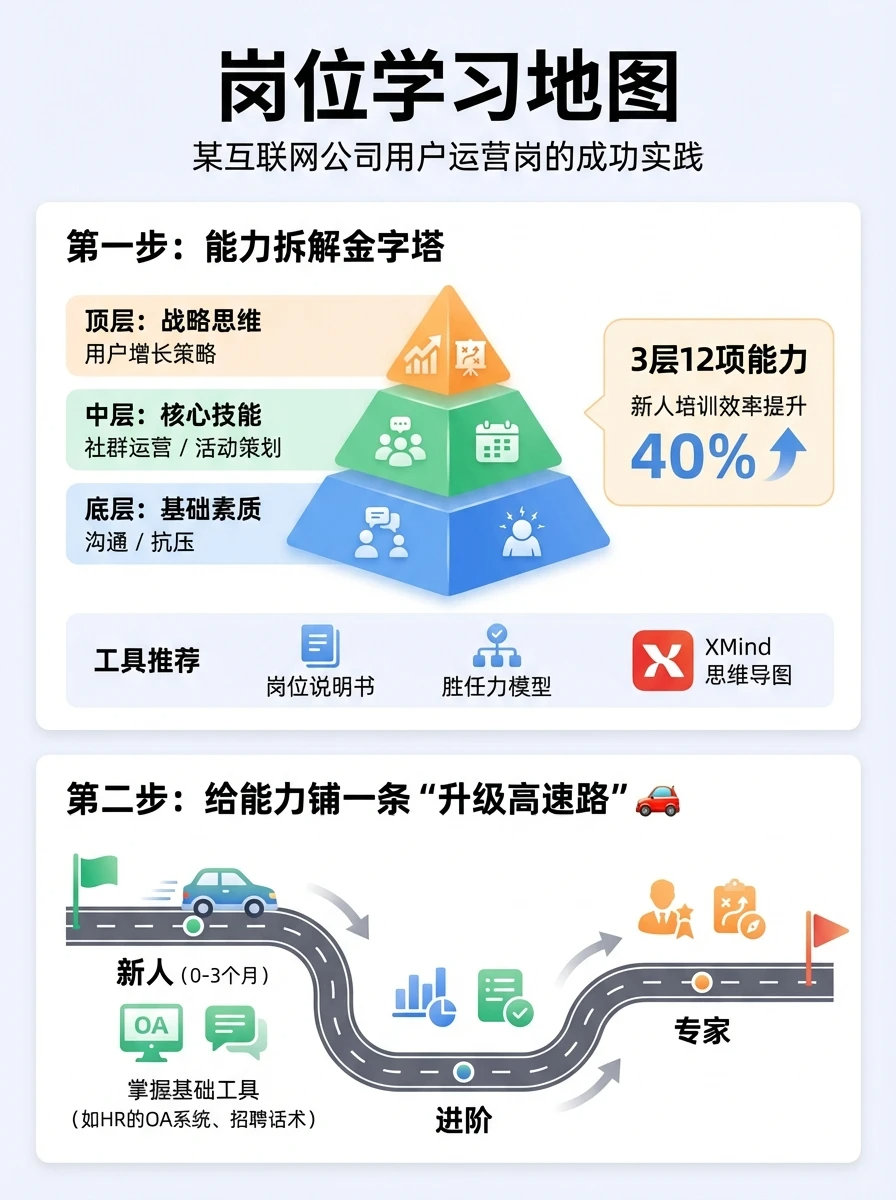 用冰山模型分层:显性能力(技能/知识,如HR的劳动法、Excel)+隐性能力(素养/动机,如同理心、成就欲)。某互联网公司把“用户运营”岗拆成3层12项能力(底层沟通/抗压、中层社群运营/活动策划、顶层用户增长策略),新人培训效率提升40%!工具推荐:岗位说明书+胜任力模型,用XMind画思维导图更清晰。