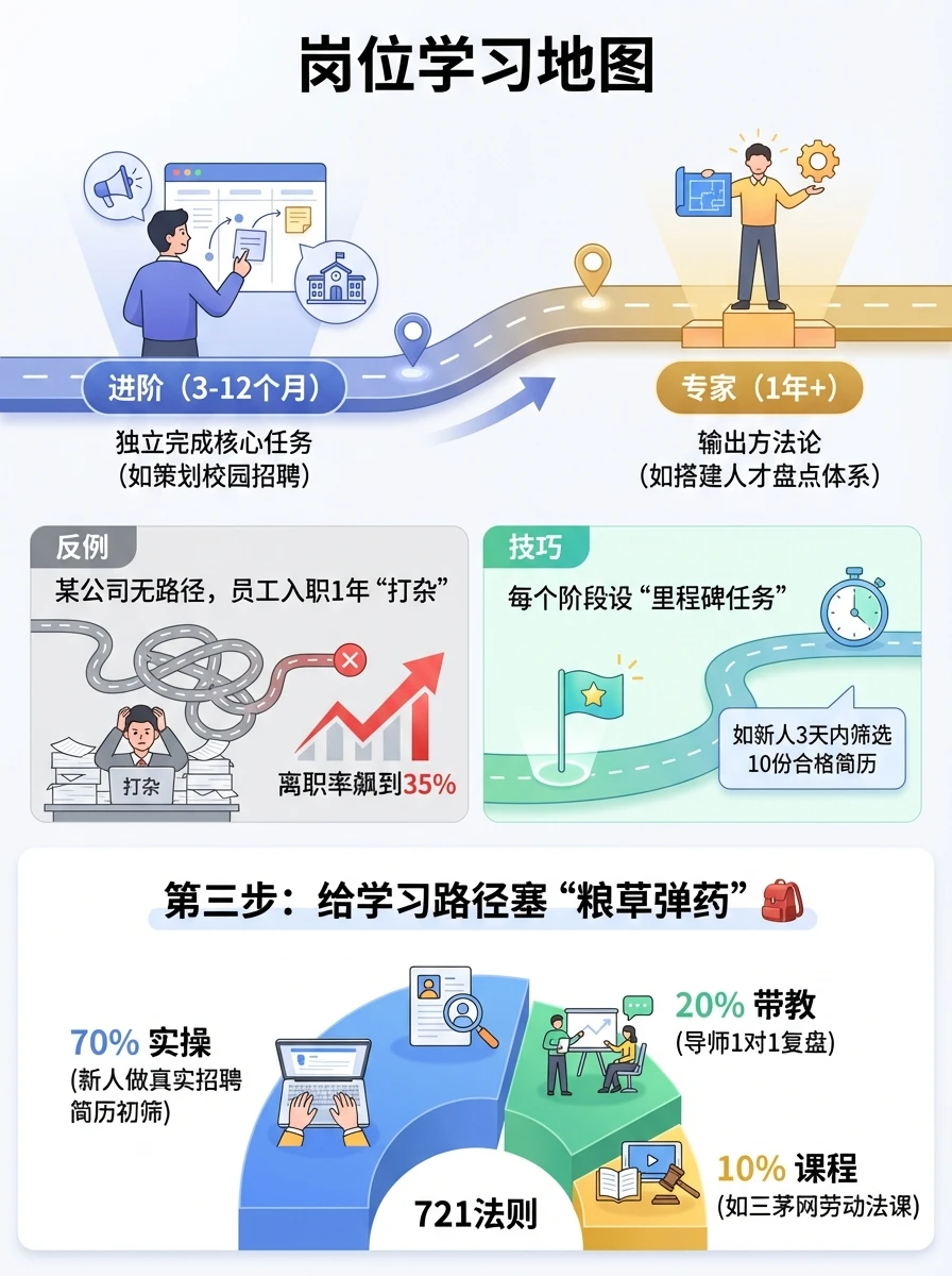 按新人-进阶-专家分阶段:新人(0-3个月)掌握基础工具(如HR的OA系统、招聘话术);进阶(3-12个月)独立完成核心任务(如策划校园招聘);专家(1年+)输出方法论(如搭建人才盘点体系)。反例:某公司无路径,员工入职1年“打杂”,离职率飙到35%!技巧:每个阶段设“里程碑任务”(如新人3天内筛选10份合格简历)。