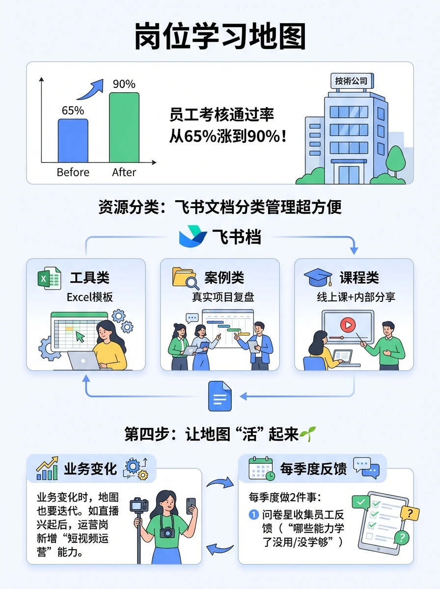 业务变化时,地图也要迭代!如直播兴起后,运营岗新增“短视频运营”能力。每季度做2件事:① 问卷星收集员工反馈(“哪些能力学了没用/没学够”);② 对标大厂JD更新点。某零售公司每季度迭代,员工满意度从60%涨到95%!小技巧:设“地图管理员”(HR+业务leader共同维护)。