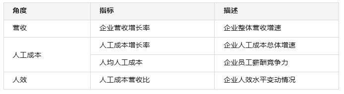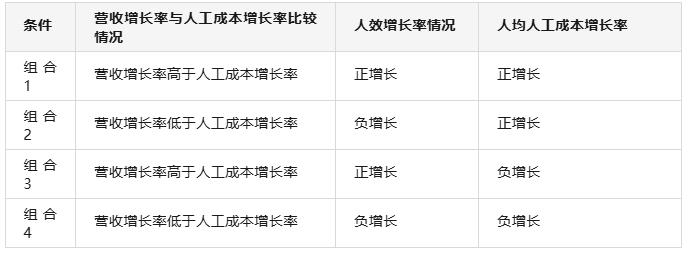 • 营收增长率高于人工成本增长率; • 人效正增长; • 人均人工成本负增长。