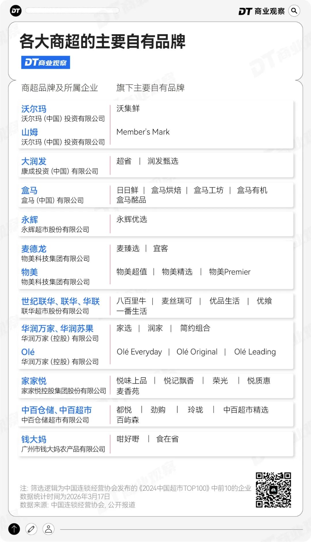 除了大家比较熟知的,山姆的MM系列、奥乐齐的超值系列、盒马的盒马工坊、日日鲜,老牌商超如大润发、世纪联华、物美,也都在近几年发力“自有品牌”,尤其是在生鲜、烘焙、零食等类目上。