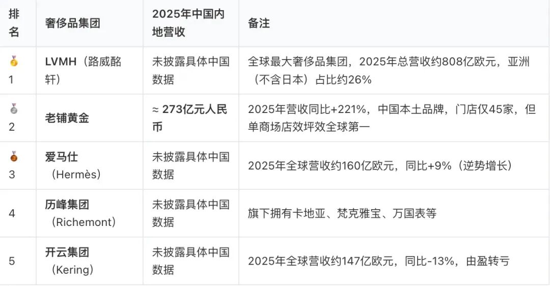 2025年奢侈品集团在中国内地的整体收入排名/制表 诺言