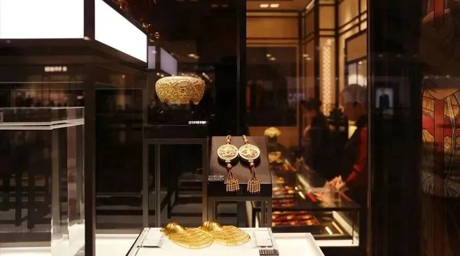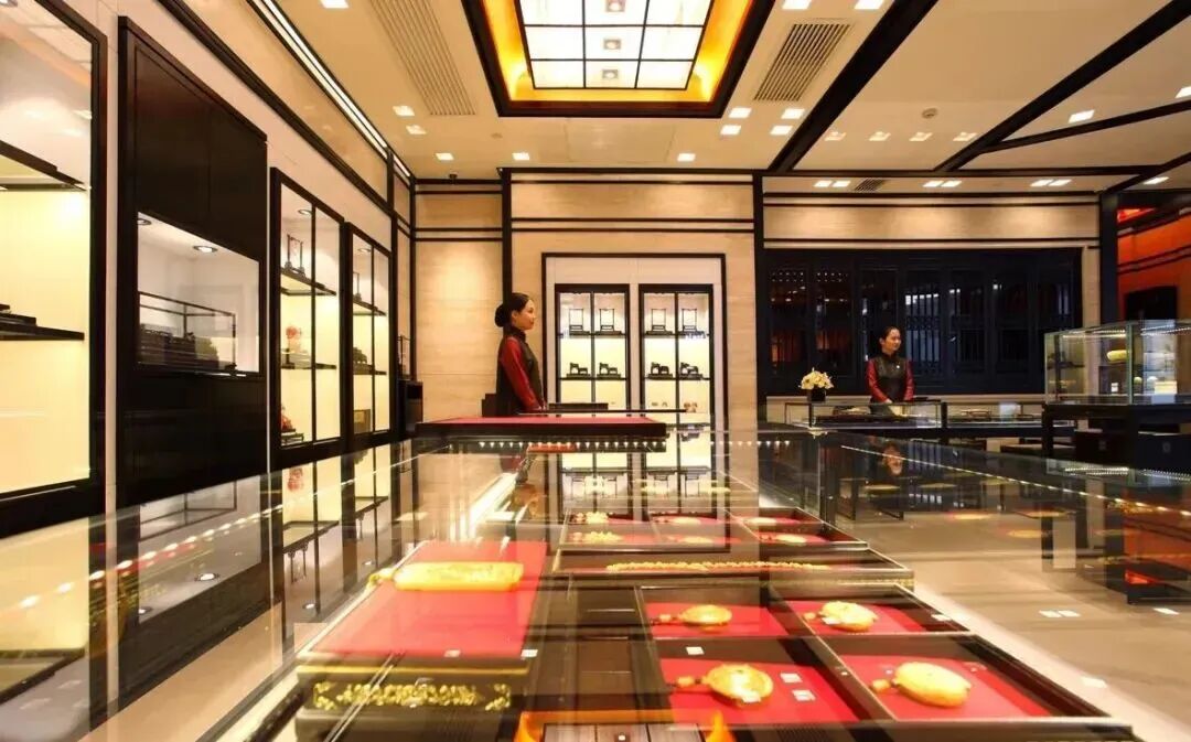 老铺黄金的门店选址多位于北京SKP、上海恒隆等高级商场,店内陈设偏向博物馆风格,进店消费者享有一对一服务,销售人员对品牌历史和工艺背景的熟悉程度远高于普通珠宝导购。
